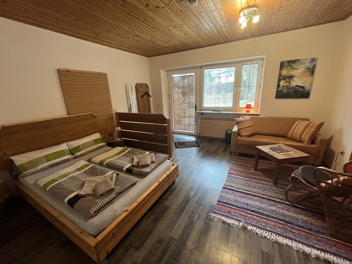 Meine Unterkunft ist in der Nähe von Naturschutzgebiet Grüner See,Berge, Wald, Wiese, Badesee. Bachlauf an der Grundstücksgrenze.. Du wirst meine Unterkunft lieben wegen komfortablem Bett, Licht, Küche, Gemütlichkeit, schöne Terasse, eigener Garten für die Gäste. Meine Unterkunft ist gut für Paare, Alleinreisende, Abenteurer, Familien mit 2 Kindern (in der Wohnküche befindet sich eine ausziehbare Schlafcouch) .