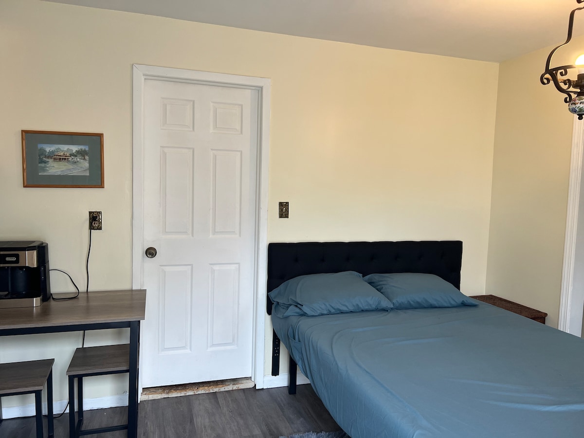 Clean, cozy studio with Private bath and Shower. Includes full size bed, large screen tv. Refrigerator, Microwave, Kuerig Coffee machine, Iron, Hairdryer and Wifi. This is a one room suite.