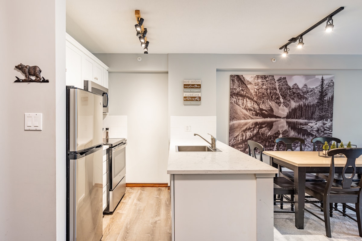 Modern, bright, clean and cozy. Located directly above all amenities in the Marketplace Pavillion on Main St. An elevator ride away from all shops, groceries, chair lifts and the main village. The building has free heated underground parking, a shared rooftop hot tub in a fully secured building. In suite laundry washer/dryer, fireplace and fully stocked kitchen. Bathroom has a bathtub/shower. The suite is private and located on the 3 rd floor with nice a balcony and beautiful views.