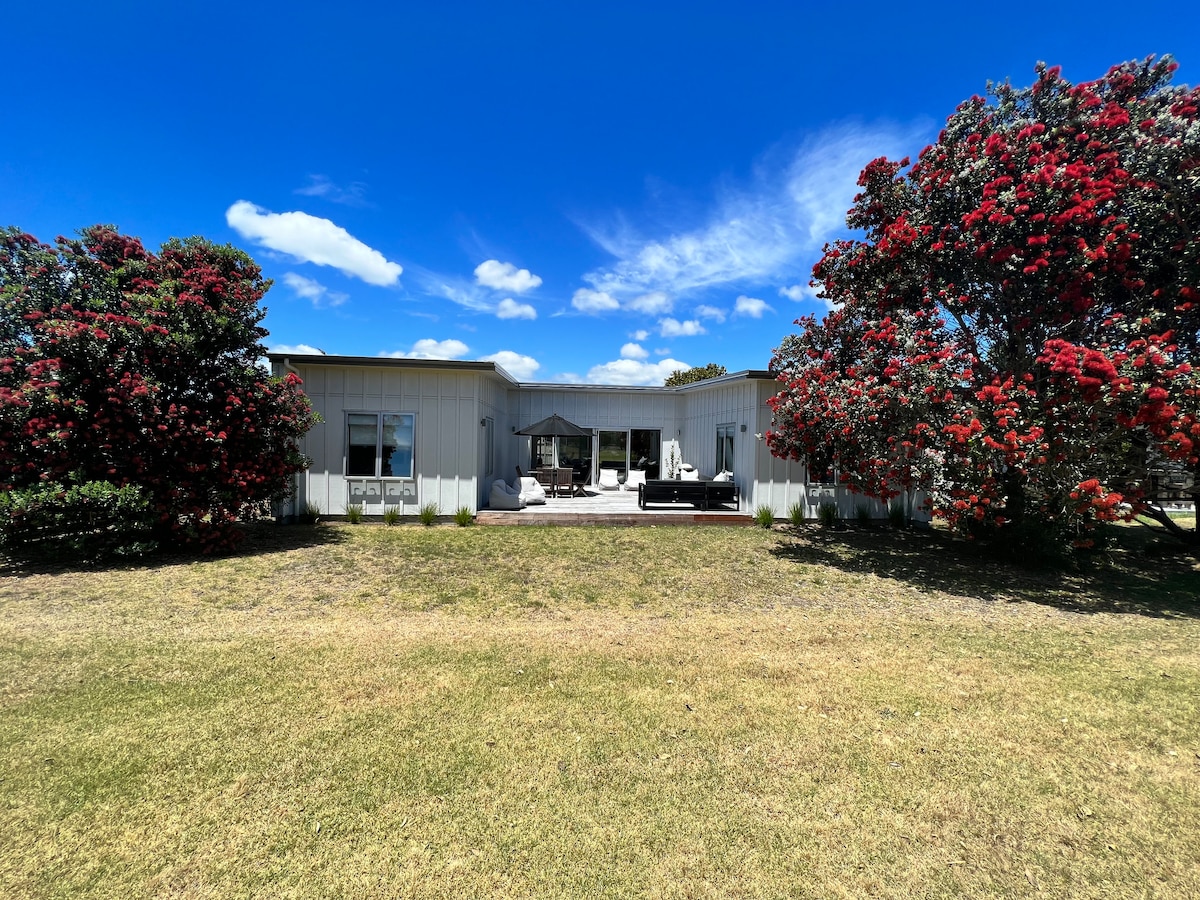 Modern holiday home, on the beach in the prestigious Pines enclave. This stylish, contemporary 4 bed home is set on 1 level & will sleep 2/3 families & 14 guests. The home is on 2330m of land in a forest setting with a large flat beachfront lawn. The 4.5km white sand beach is a minute stroll across the foreshore reserve & the golf course is a 2min walk away. The rear deck enjoys forest views whilst the master & guest bedrooms, living areas & front deck all enjoy glorious unobstructed sea views.