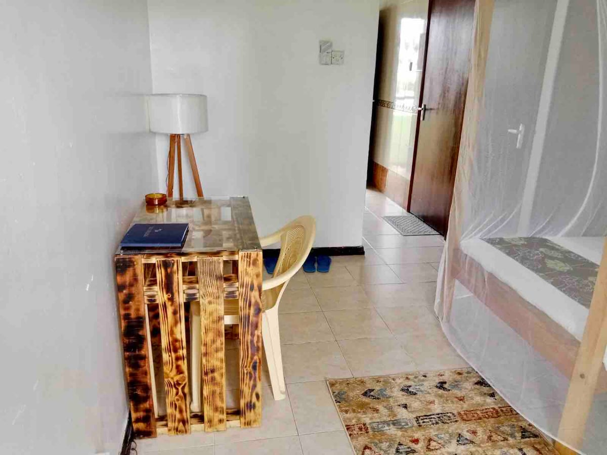 Rest and relax both inside and out in a Private Home. The house is 15mins minutes walk and a 5mins drive to Nyali beach. - Has a twin bed. - Flat screen and free WiFi - Closet equipped with hangers and drawers + iron box - Well-equipped kitchen - spacious, clean bathroom The studio is a detached private guesthouse in the back of the property. There are 3 houses in the compound; Guests will have their privacy and entry area and backyard space.
