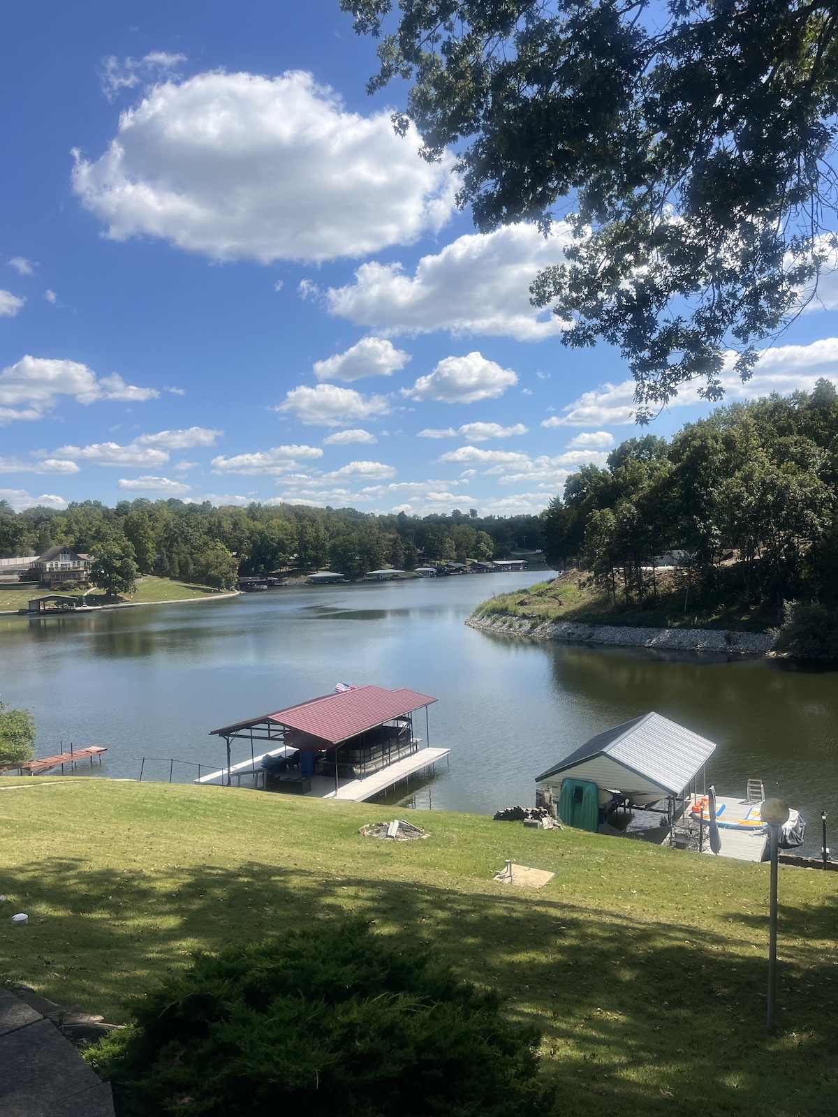 Ευρύχωρο, καλοδιατηρημένο σπίτι με όλα τα νέα κρεβάτια!2 υπνοδωμάτια και 1 κουκέτα- μπορεί να φιλοξενήσει άνετα 8 άτομα. Πανέμορφη θέα της λίμνης από μέσα ή έξω, φωλιασμένη σε έναν ήσυχο όρμο. Υπέροχος εξωτερικός χώρος - δύο μεγάλες ξύλινες βεράντες με καθίσματα, τραπεζαρία, υδρομασάζ και ψησταριά, τζάκι εξωτερικού χώρου και αποβάθρα για ψάρεμα! Πλήρης κουζίνα, 2 πλήρη μπάνια-ντους, μπανιέρα/σόου και πλυντήριο ρούχων εξοπλισμένο με πλυντήριο και στεγνωτήριο. Πρόσβαση σε wifi και δύο τηλεοράσεις. Χαμηλότερο επίπεδο οικογενειακό δωμάτιο με βρεγμένο μπαρ, τραπέζι παιχνιδιών, βελάκια και επιτραπέζια παιχνίδια. Κλείστε τη διαδρομή για την πόλη!