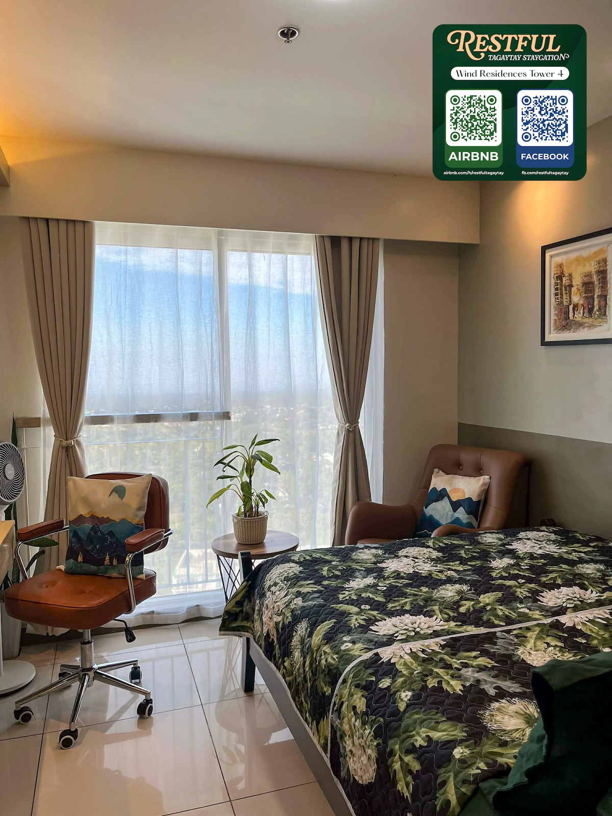 Καλώς ήρθατε στην άνετη γωνιακή μονάδα μας, προσφέροντας άνεση, ηρεμία και εκπληκτική θέα. Το γοητευτικό κατάλυμά μας βρίσκεται στην προνομιακή τοποθεσία του Ταγκαϊτάι και προσφέρει όλα όσα χρειάζεστε για μια αξέχαστη διαμονή. 📍 SMDC Wind Residences Tower 5, 19th floor. Ο χώρος φιλοξενεί έως 4 επισκέπτες (συμπεριλαμβανομένων των παιδιών και των βρεφών).