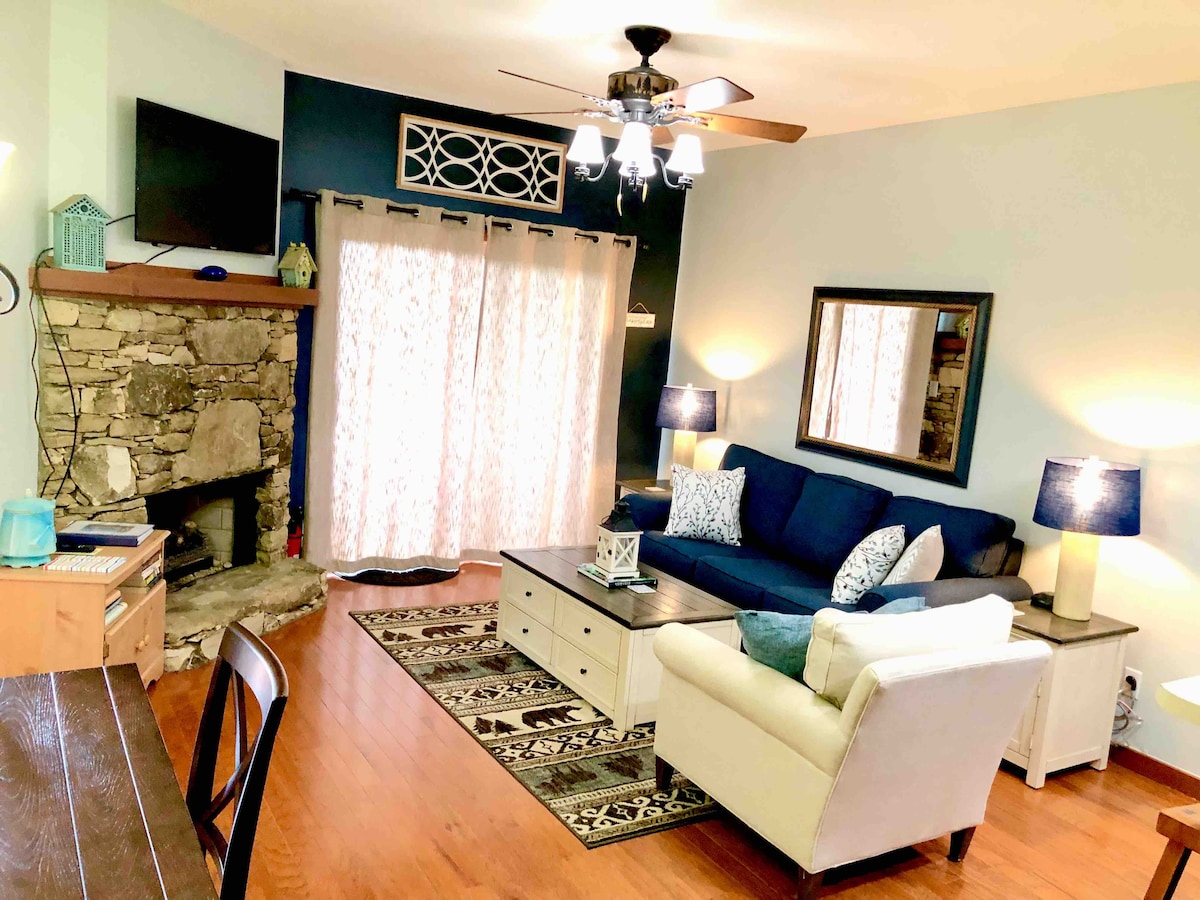 "From Ski To Shining Sea" *** Nestled in the Blue Ridge Mountains of Western North Carolina, you will thoroughly enjoy the breathtaking long-range mountain views from your PRIVATE balcony! Fireplace! Newly renovated! Jetted tub! So serene! This 1 king bedroom, 1 bathroom condo, w/ an additional queen sleeper sofa, comfortably sleeps 4. Inside, cozy up to the warm fireplace. Completely remodeled! On premises: ski resort, hiking, tennis, pool, fishing & so much more! Asheville only 30 miles away!