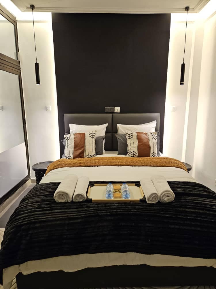 "Chez Ébène – κομψό και ευρύχωρο διαμέρισμα στο Μπονάνχο της Ντουάλα. Εμπνευσμένο από τη Νότια Αφρική και το Καμερούν, αυτό το διαμέρισμα συνδυάζει την κομψότητα του μαύρου με τις πινελιές της αφρικανικής τέχνης. Κουκούλι, φωτεινό σαλόνι, εξοπλισμένη κουζίνα. Ήσυχη γειτονιά, κοντά σε παροχές. Ιδανικό για ζευγάρια ή επαγγελματίες. Κάντε κράτηση για το γαλήνιο καταφύγιο σας και απολαύστε μια διαμονή σε ένα μοναδικό περιβάλλον, όπου ο νεωτερισμός και η αυθεντικότητα συναντιούνται ". Διαθέσιμη: Netflix, οπτική ίνα, κανάλι + και γεννήτρια