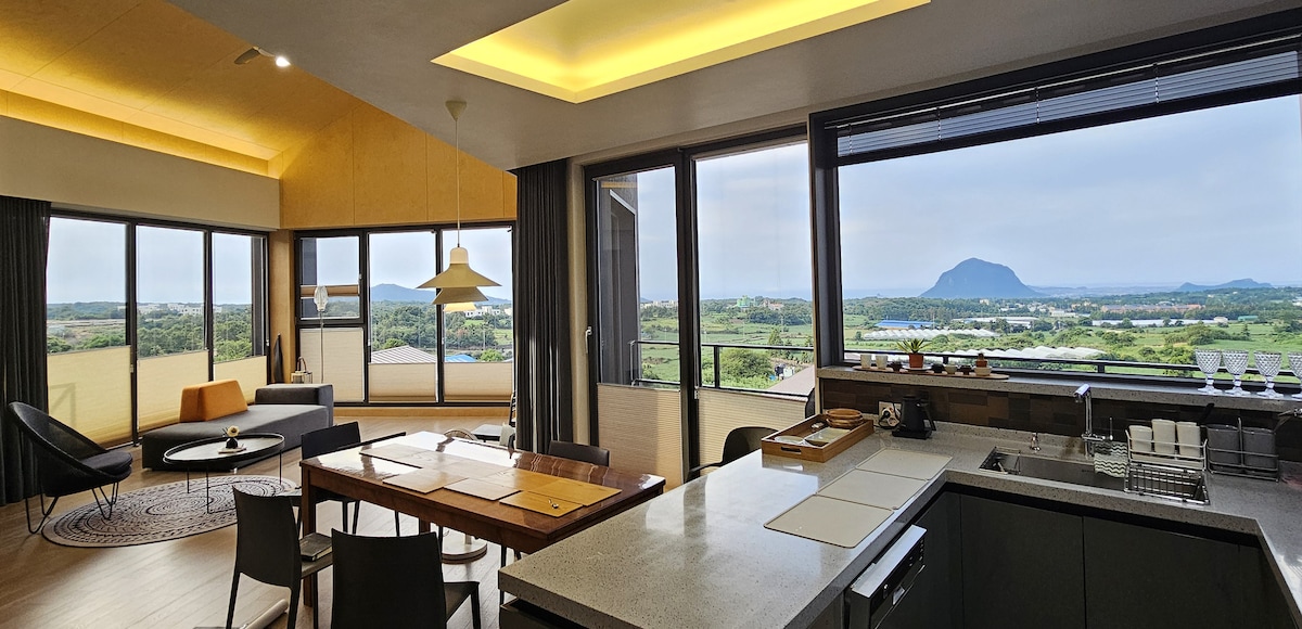 Hello. It is located on a cliff in the center of Seogwipo, so it has a perfect ocean view with permanent views. It is a one-bedroom type, but unlike other one-bedroom types of accommodations, it provides a large area, The bedroom, living room, and kitchen are completely separated, making it an efficient movement. We would like to provide breakfast in a wonderful space that boasts the best sea view along with a shared swimming pool to give you comfort and comfort on your trip to Jeju.