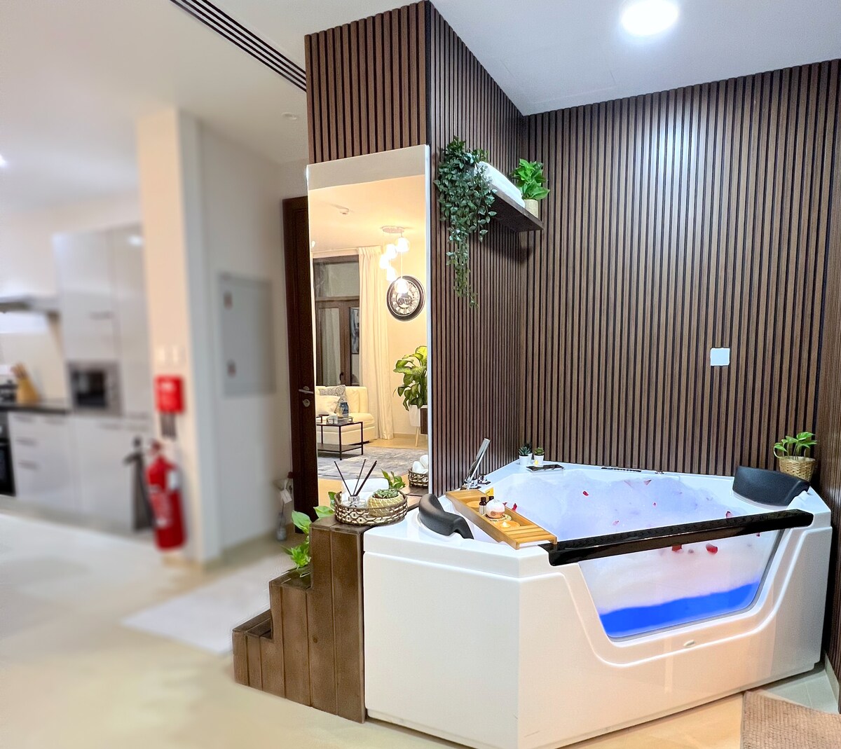 Η απόδρασή σας ξεκινά εδώ. Διαμέρισμα με πλήρη εξυπηρέτηση (1 υπνοδωμάτιο) στην καρδιά του κόλπου του Μασκάτ. Σχεδιασμένο μοναδικά για ζευγάρια και οικογένειες που αναζητούν ένα ξεκούραστο καταφύγιο και μια μοναδική εμπειρία. Απολαύστε έναν υπέροχο ύπνο σε ένα υπέρδιπλο κρεβάτι και δύο κανονικού μεγέθους καναπέδες-κρεβάτια. Απολαύστε το εσωτερικό ντους ή αναζωογονήστε τις αισθήσεις σας στο μεγάλο ιδιωτικό τζακούζι σας. Ατελείωτες δραστην περιοχή του MuscatBay, με ολυμπιακή πισίνα, απίστευτες περιοχές πεζοπορίας και ιδιωτική παραλία.