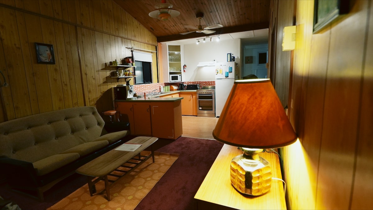 North facing warm and bright shack that makes the most of the sun all year. This is a contemporary take on a 1950's beach shack with louvres to make the most of sea breezes. It is situated opposite a reserve, 200m walking distance to the two main beaches, with a quiet off-road walking path directly in front of the house that cuts through directly to the popular penguin point beach. There is large deck to enjoy the surrounding natural vegetation equipped with festoon lighting.