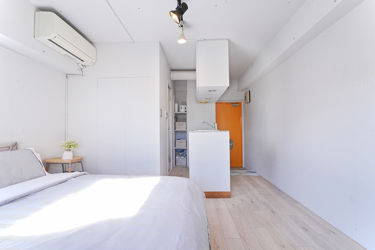 A serene, minimal loft just one stop from Shibuya and Roppongi—perfect for solo travelers or focused remote work. Featuring fast Wi-Fi, an Aeron chair, and a compact double bed (150×210cm)—ideal for one, cozy for two. The glass bathroom and sleek concrete walls give it a modern edge (note: some winter condensation—just run the bathroom fan). While there’s no closet, the space fits four large suitcases and includes a hanging bar and ten wall hooks to keep things tidy.Laundry service weekly.
