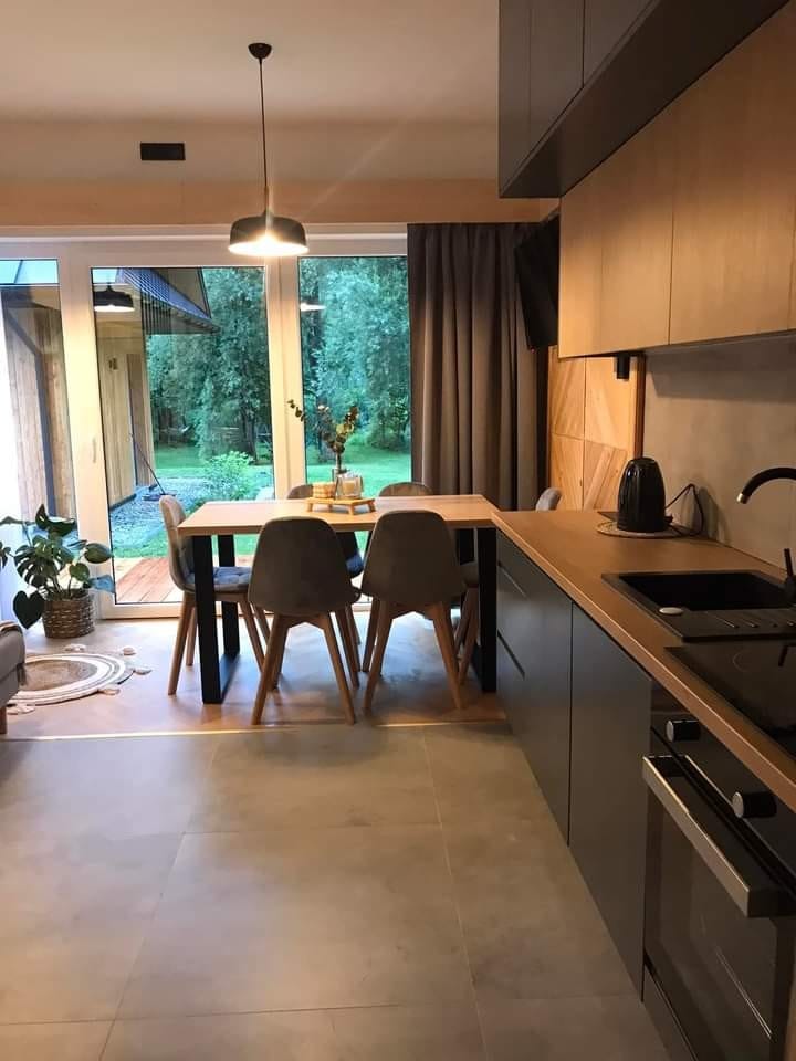 A luxurious chalet with a beautiful view of the Tatra Mountains panorama for 4 or 6 people located on Salamandra (Kościelisko). - two lockable bedrooms with double beds, - two bathrooms with a shower (one additionally with a bathtub), - a living room with a sofa bed for 2 people with a terrace, - a kitchenette with a coffee machine, induction, fridge, dishwasher, dishes. There is a free self-service electric sauna outside. Each chalet has two free parking spaces assigned.