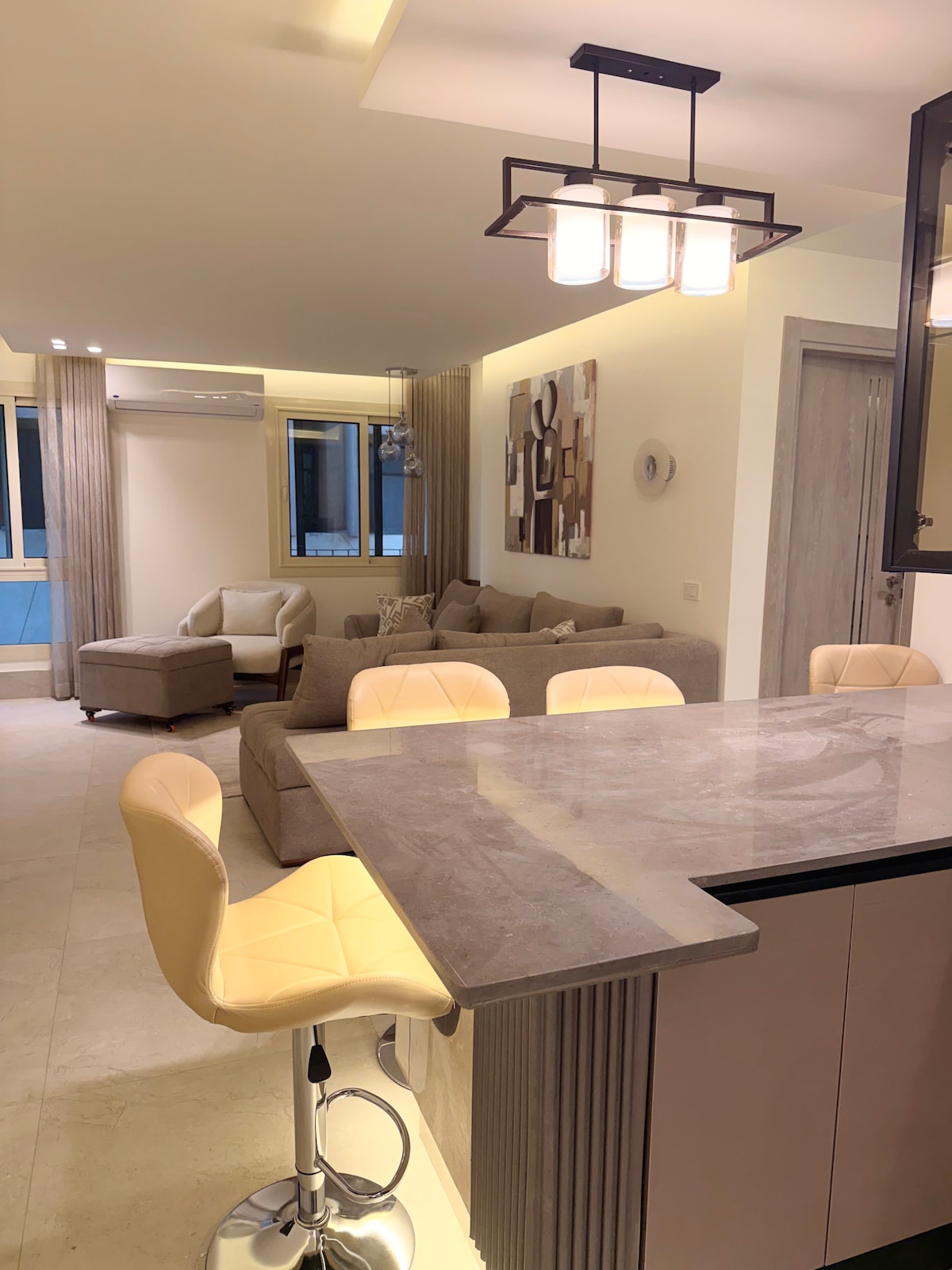 ✨ Experience modern elegance and timeless charm in this artfully restored Cairo apartment. 🎨 Highlights include: • Custom local artwork • Peaceful bedrooms with private balconies • Fully equipped built-in kitchen • Two stylish bathrooms 📍 Just steps from 26th of July St, The Hilton, and the Nile, it’s the perfect retreat near award-winning restaurants, embassies, and transit. 🌙 A charming hallway window offers a glimpse of the Nile, especially magical when it lights up at night.