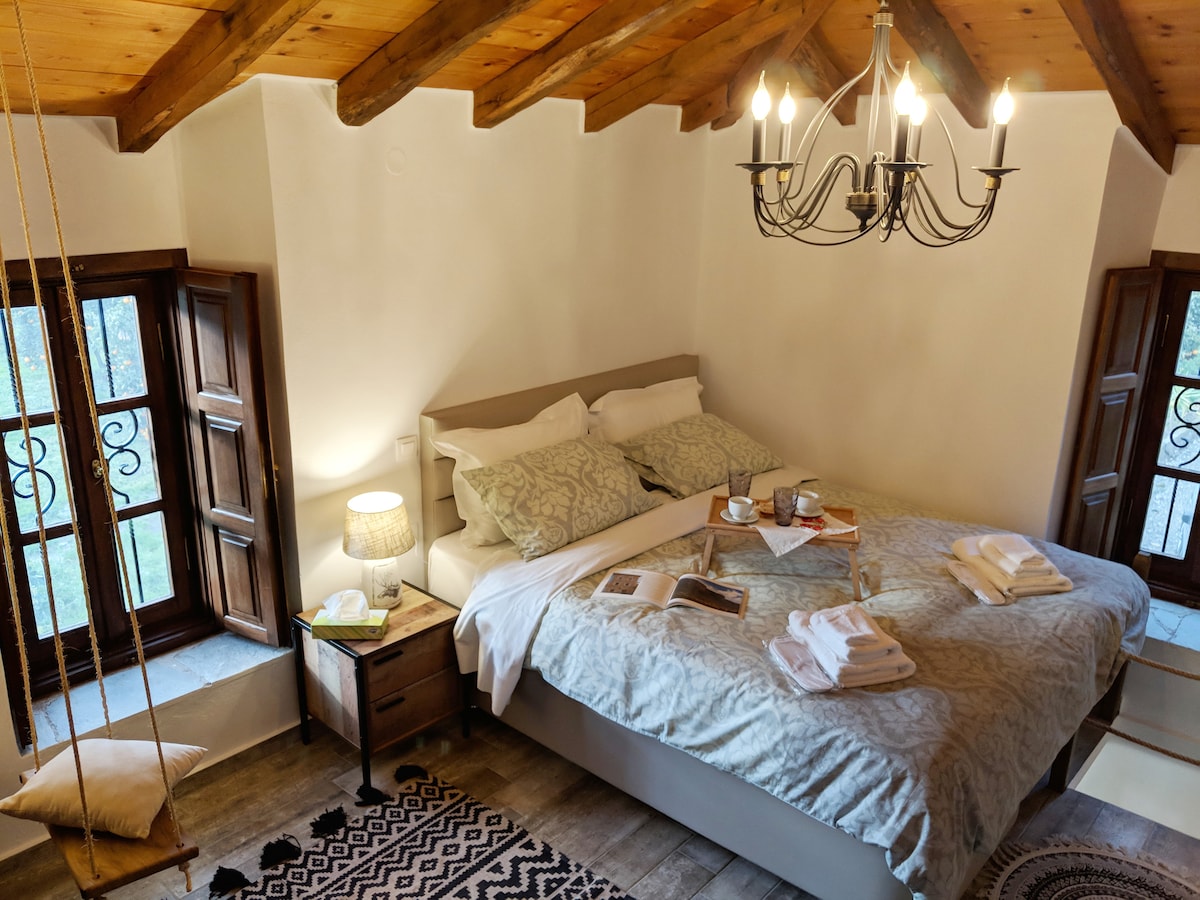 Όμορφο και άνετο σπίτι με ξύλο και πέτρα που σας ταξιδέυει στην τοπική παράδοση. Διαθέτει δύο κρεβατοκάμαρες με ξύλινο πάτωμα που κοιμίζουν 3 και 4 άτομα αντίστοιχα . Η πρόσβαση σε κουζίνα και μπάνιο γίνεται από την βεράντα όπως φαίνεται στις φωτογραφίες.Έχει κοινή αυλή με το εκκλησάκι που βρίσκεται δίπλα όπου μπορούν να παίζουν τα παιδιά της γειτονίας με ασφάλεια. Έχει πρόσβαση σε αυτήν αυτοκίνητο εώς την πόρτα του σπιτιού για Parking μικρής διαρκείας, απαγορεύται όμως το 24ωρο.