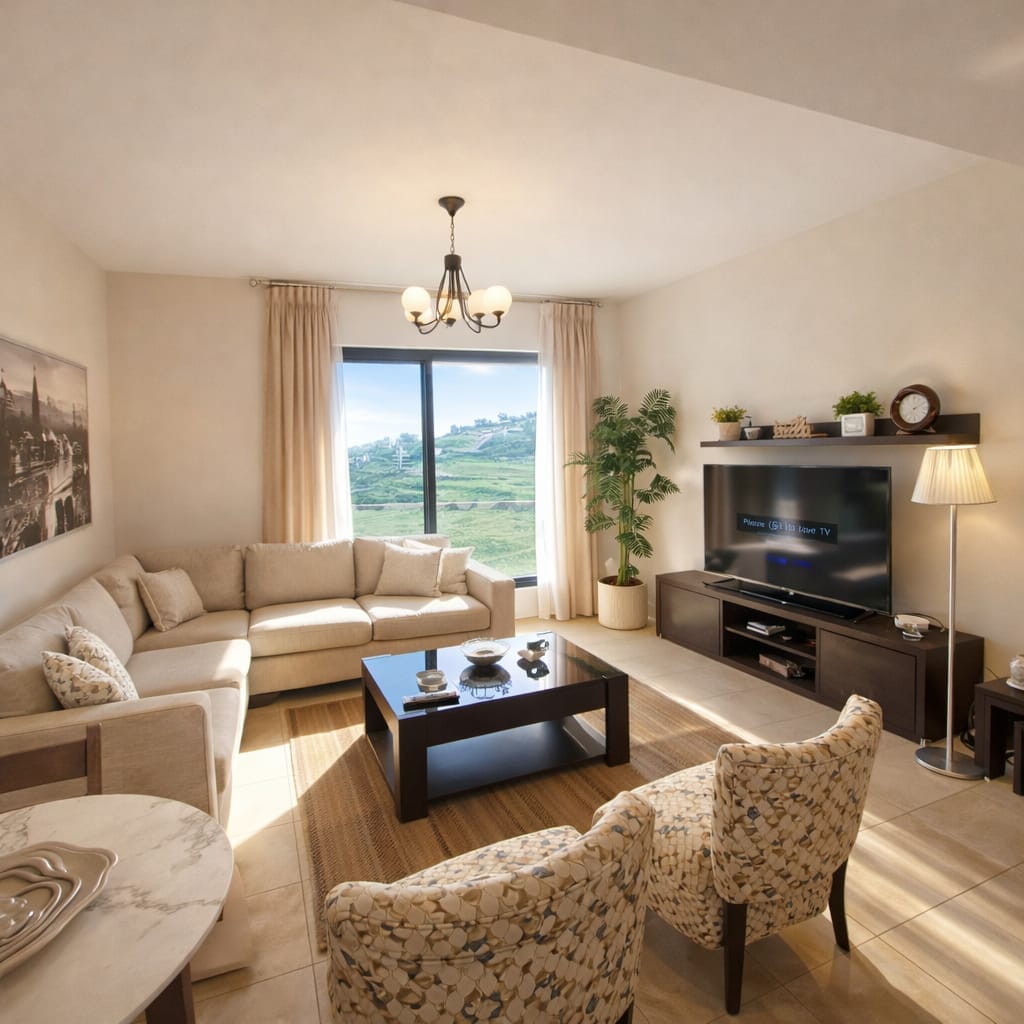 Modern luxury in the heart of Amman. This spacious 3-bedroom, 2.5-bathroom apartment accommodates up to 8 guests with sleek marble floors, LED lighting, and a stylish open living area. Highlights include a custom German kitchen with premium appliances, in-unit washer/dryer, and a private balcony with seating for five and a swing. With air conditioning in every room and high-speed WiFi, it’s the perfect stay for families, business travelers, or groups seeking comfort and style.